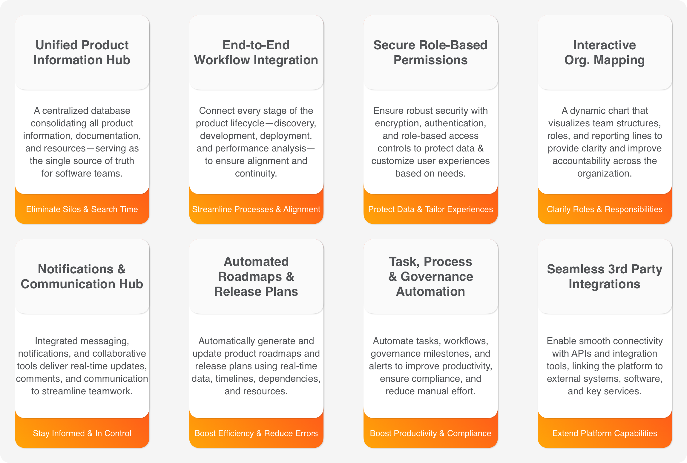 The Product Database provides software clarity, transparency, consistency, and connection—enabling teams to quickly find answers & reduce ambiguity.